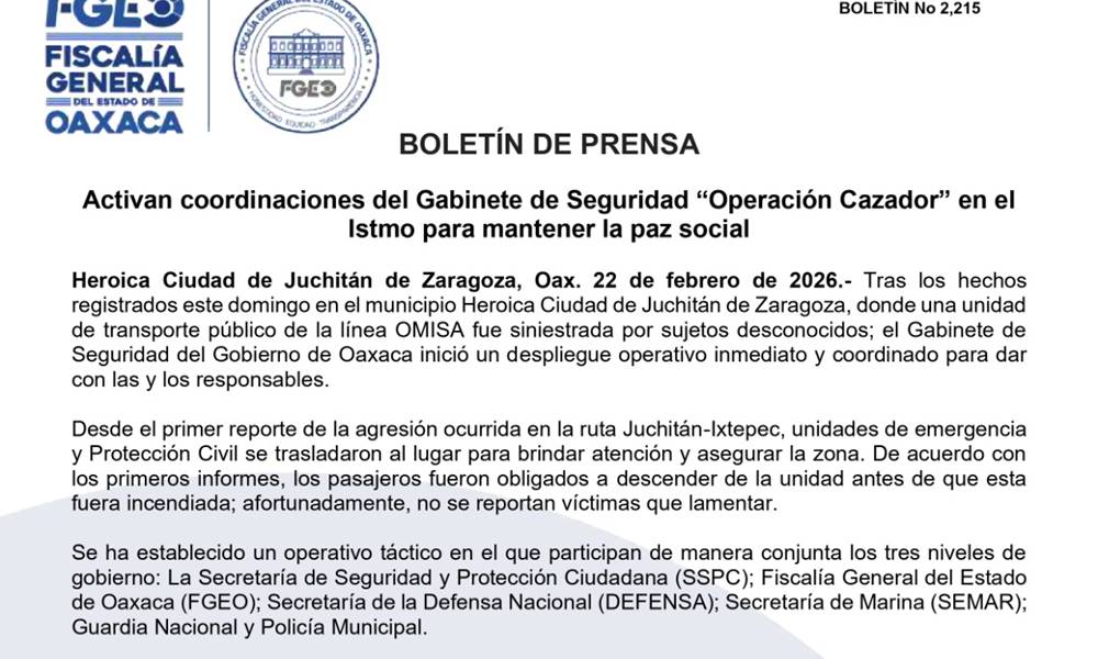 Heroica Ciudad de Juchitán de Zaragoza, Oax. 22 de febrero de 2026.- Tras los hechos registrados este domingo en el municipio Heroica Ciudad de Juchitán de Zaragoza, donde una unidad de transporte público de la línea OMISA fue siniestrada por sujetos desconocidos; el Gabinete de Seguridad del Gobierno de Oaxaca inició un despliegue operativo inmediato y coordinado para dar con las y los responsables.