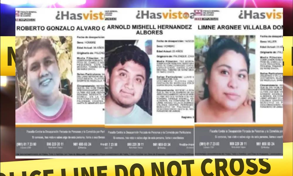 Chiapas.- Tres jóvenes, identificados como Arnold Mishell Hernández Albores y Limme Argnee Villalba Domínguez, ambos de 23 años, además de Roberto Gonzalo Álvaro Gómez, de 36, fueron reportados como desaparecidos tras perder contacto el sábado 14 de febrero a las 16:25 horas en Palenque, viajaban en una camioneta GMC Yukon con placas del Estado rumbo a la zona del río Chancalá.
