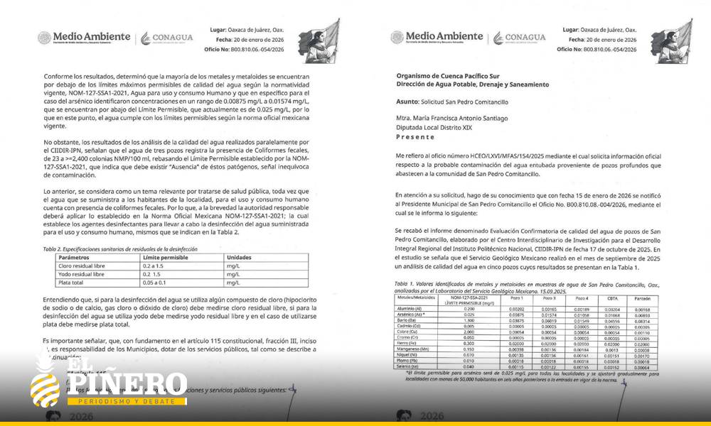 De acuerdo con un oficio emitido por la Comisión Nacional del Agua (CONAGUA), con fecha 20 de enero de 2026, y firmado por la Dirección de Agua Potable, Drenaje y Saneamiento del Organismo de Cuenca Pacífico Sur, los análisis de calidad del agua realizados de manera paralela por el Centro Interdisciplinario de Investigación para el Desarrollo Integral Regional del Instituto Politécnico Nacional (CIIDIR-IPN) detectaron la presencia de coliformes fecales en tres pozos que abastecen a la comunidad.