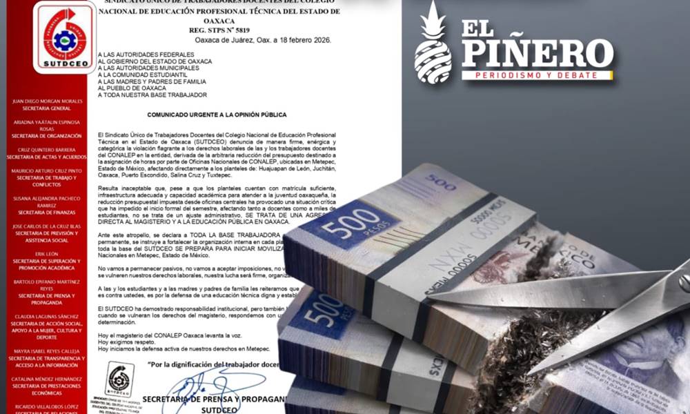 Oaxaca de Juárez, Oax.– El Sindicato Único de Trabajadores Docentes del Colegio Nacional de Educación Profesional Técnica del Estado de Oaxaca (SUTDCEO) emitió un comunicado urgente a la opinión pública en el que denuncia una presunta violación a los derechos laborales del magisterio derivada de la reducción presupuestal aplicada por oficinas nacionales del CONALEP.