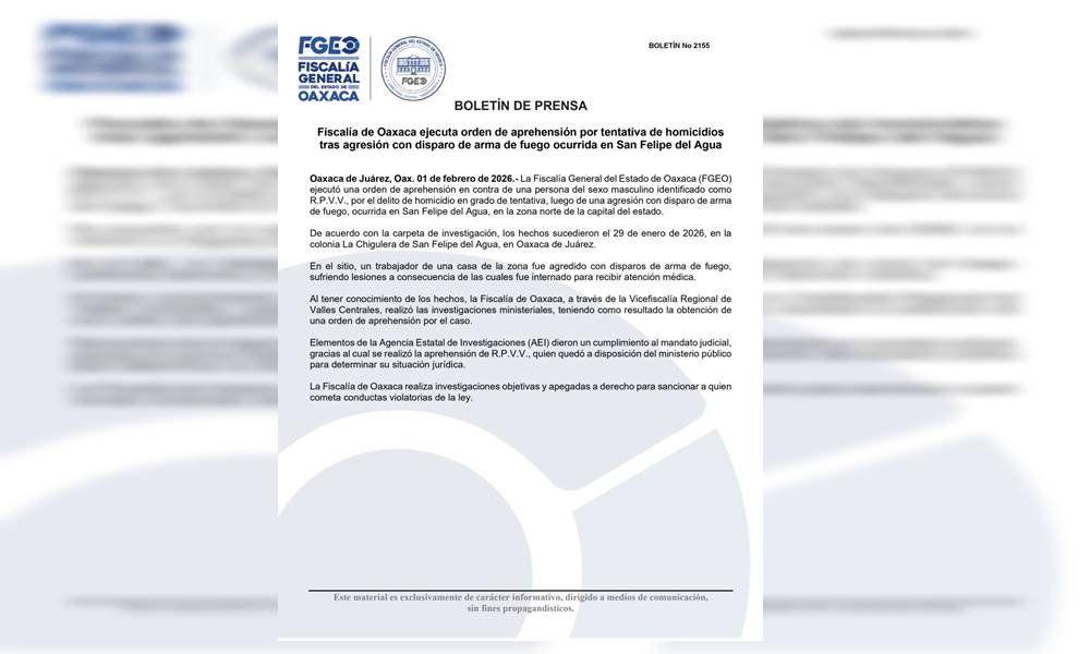 Oaxaca de Juárez, Oax. 01 de febrero de 2026.- La Fiscalía General del Estado de Oaxaca (FGEO) ejecutó una orden de aprehensión en contra de una persona del sexo masculino identificado como R.P.V.V., por el delito de homicidio en grado de tentativa, luego de una agresión con disparo de arma de fuego, ocurrida en San Felipe del Agua, en la zona norte de la capital del estado.