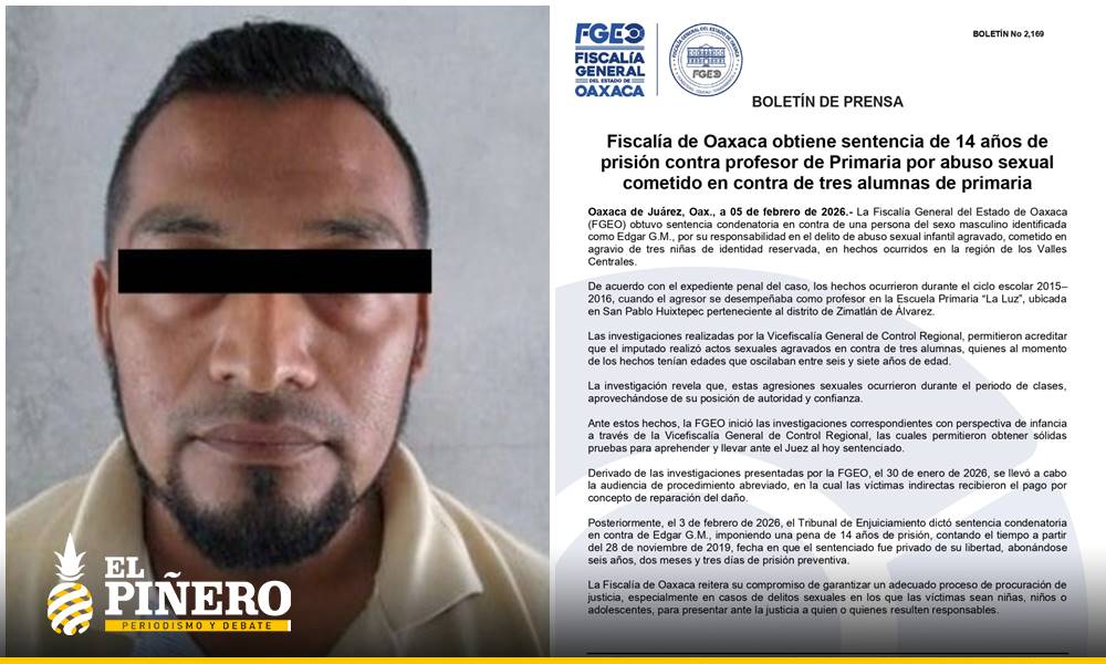 Oaxaca de Juárez, Oax., a 05 de febrero de 2026.- La Fiscalía General del Estado de Oaxaca (FGEO) obtuvo sentencia condenatoria en contra de una persona del sexo masculino identificada como Edgar G.M., por su responsabilidad en el delito de abuso sexual infantil agravado, cometido en agravio de tres niñas de identidad reservada, en hechos ocurridos en la región de los Valles Centrales.