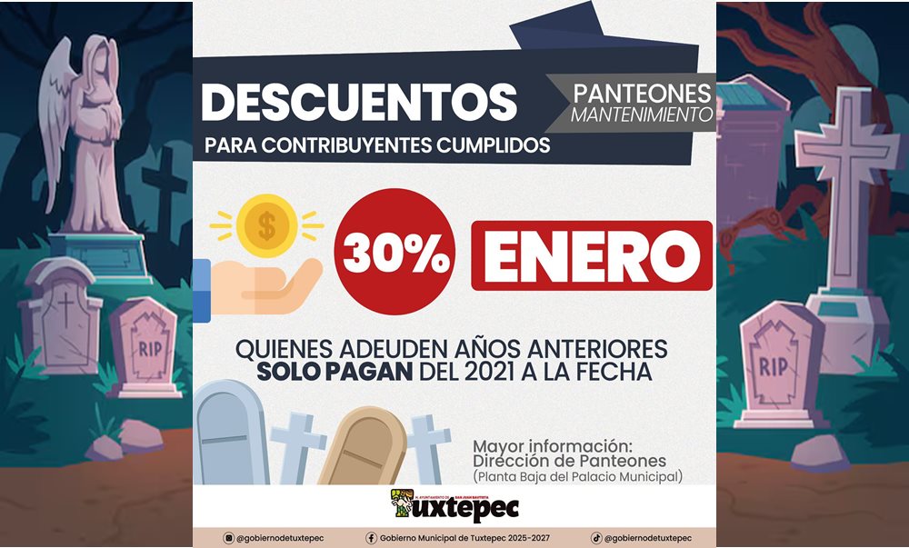 Durante el mes de enero, contamos con descuentos especiales para las y los contribuyentes que cuentan con perpetuidades en los panteones del municipio: