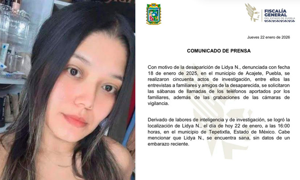 La Fiscalía General del Estado de Puebla informó que fue localizada con vida Lidya “N”, mujer de 28 años que había sido reportada como desaparecida desde hace cuatro días, luego de perder contacto con su familia mientras circulaba por una carretera del municipio de Acajete.
