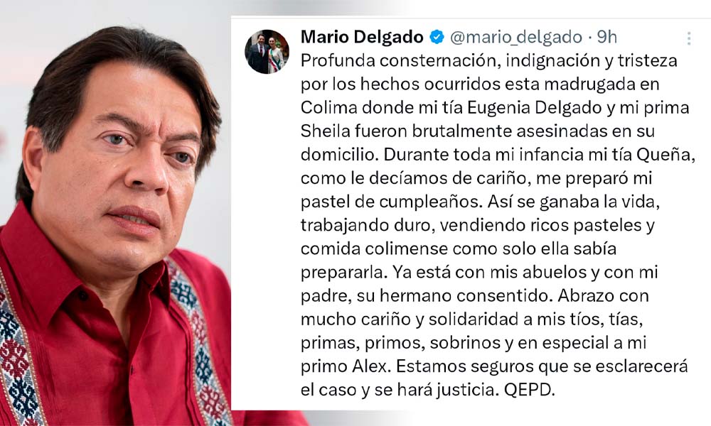 El secretario de Educación Pública, Mario Delgado, expresó públicamente su consternación e indignación tras el asesinato de su tía, Eugenia Delgado, y su prima, Sheila Amezcua Delgado, ocurrido la madrugada del sábado 31 de enero en la ciudad de Colima. Los hechos se registraron en el domicilio donde ambas residían, ubicado en la colonia Placetas, y son investigados por la Fiscalía estatal bajo el protocolo de feminicidio.