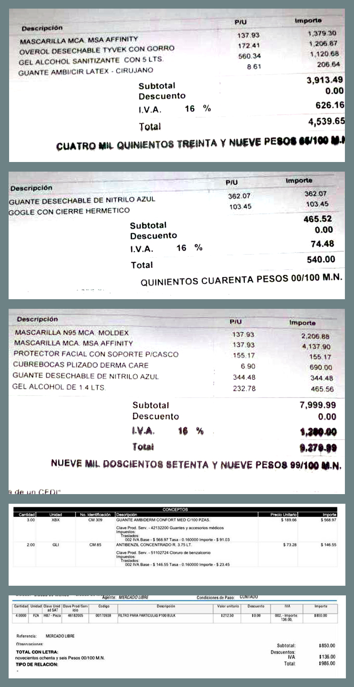 De las compras hechas en las últimas semanas hay filtro para partículas P100 Bulk, guantes Ambiderm (100 piezas), Antibenzil Concentrado (desinfectante), overol desechable, bota dunlop, toallitas húmedas, mascarillas, protector facial, cubre bocas plizado, guantes desechables, gel alcohol, gogle con cierre, gogle derma, cubre bocas N95 (10 piezas), mascarilla R95, guantes de nitrilo, lentes de protección, pijamaquirúrgica y cubre bocas con visor.