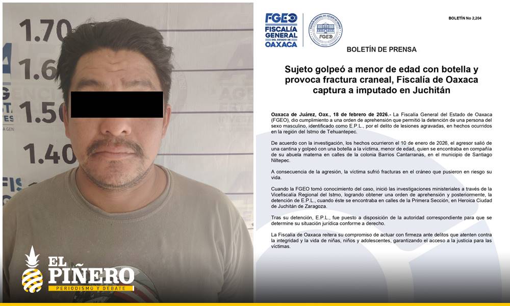 De acuerdo con la investigación, los hechos ocurrieron el 10 de enero de 2026, el agresor salió de una cantina y golpeó con una botella a la víctima, menor de edad, quien se encontraba en compañía de su abuela materna en calles de la colonia Barrios Cantarranas, en el municipio de Santiago Niltepec.
