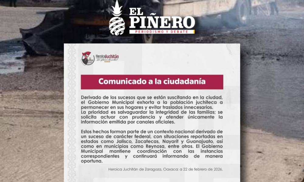Oaxaca, México.– La mañana de este domingo, el Gobierno Municipal de Heroica Juchitán de Zaragoza emitió un comunicado urgente a la ciudadanía, exhortando a la población a permanecer en sus hogares y evitar traslados innecesarios, luego de una jornada marcada por hechos de violencia registrados en distintos puntos del Istmo de Tehuantepec.