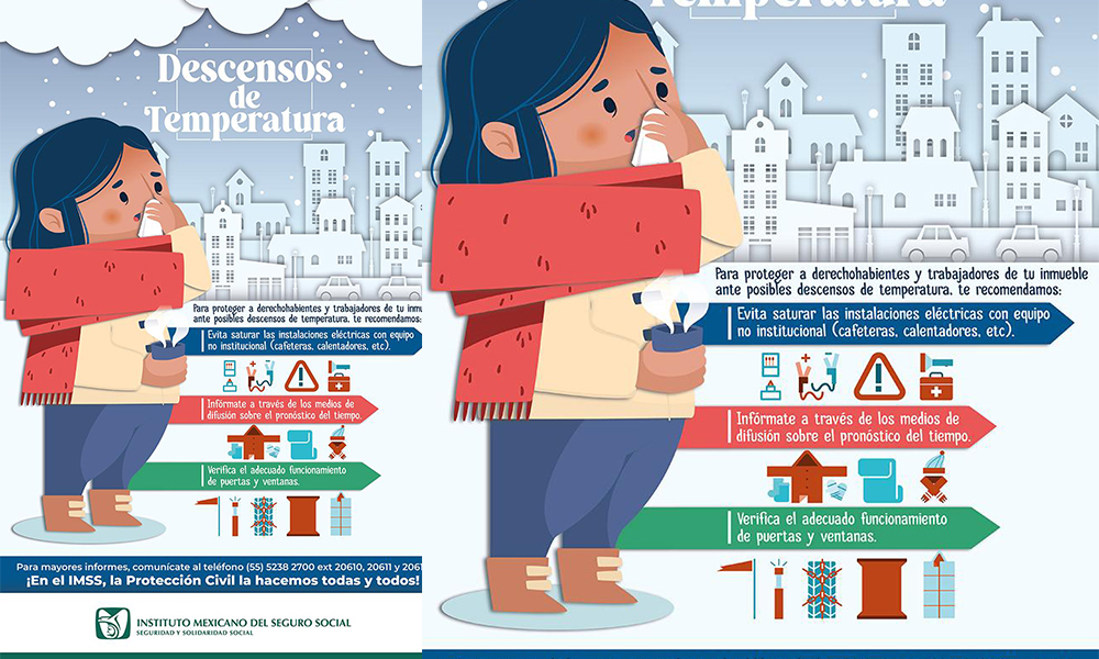 La jefa de Oficina de Protección Civil de la Delegación del IMSS en Oaxaca, Sandra Lucía Deheza, informó que derivado de esta época invernal la recomendación es vestir con ropa gruesa, cubriendo todo el cuerpo (chamarra, abrigo, bufanda, gorro, guantes, etcétera).