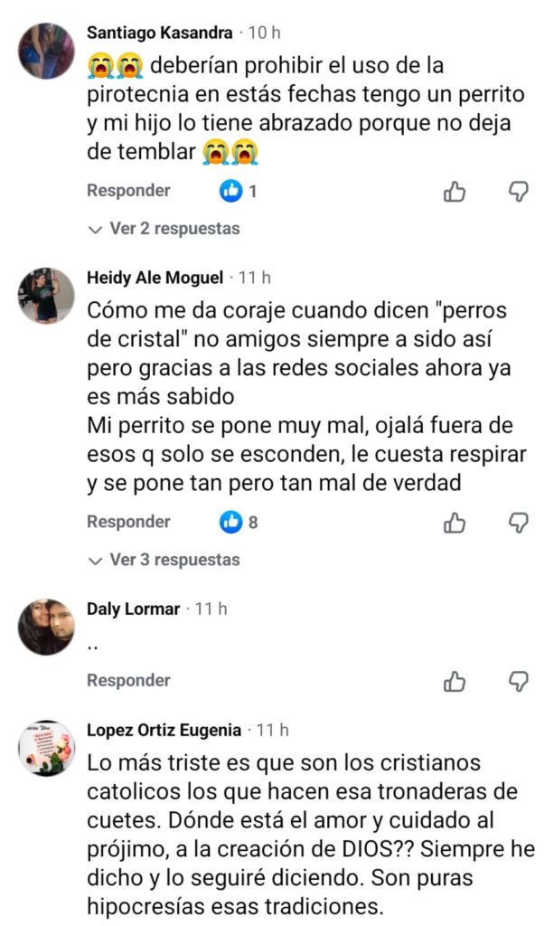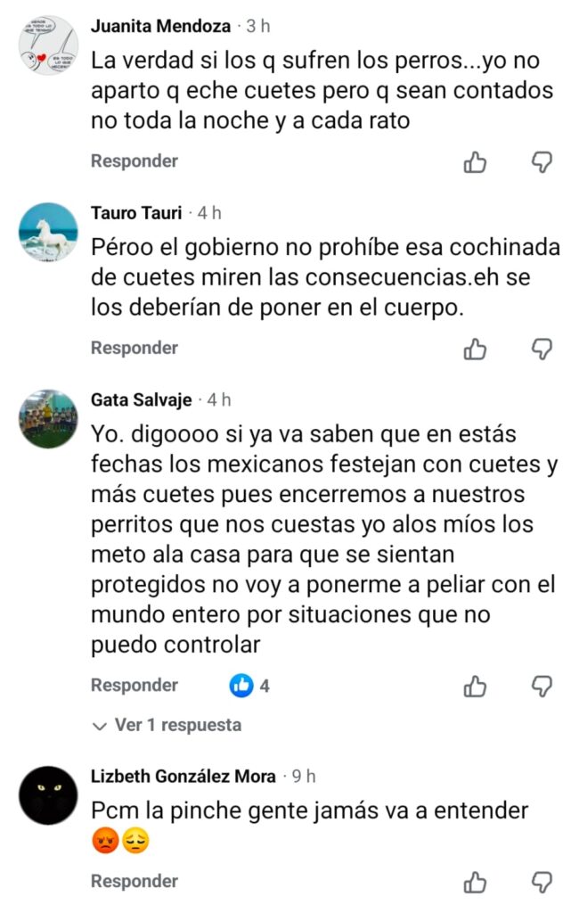 La publicación desató decenas de comentarios de internautas que coincidieron en el daño que provocan los cuetes a los animales domésticos, especialmente en temporadas festivas donde su uso aumenta considerablemente.