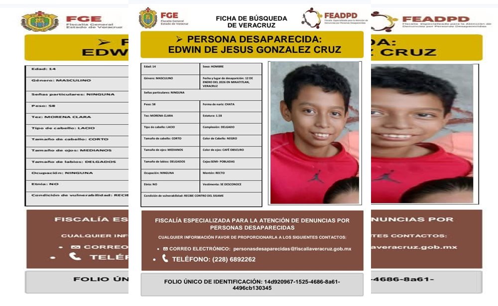 Veracruz.- Edwin de Jesús González Cruz, adolescente de 14 años originario de Coatzacoalcos, quien había sido reportado como no localizado, fue ubicado con vida en Villahermosa, Tabasco, sin indicios de afectaciones, luego de permanecer varios días sin contacto con su familia.